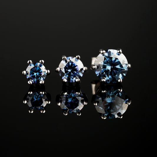 S925 银莫桑石深蓝色 6 爪圆形切割耳钉